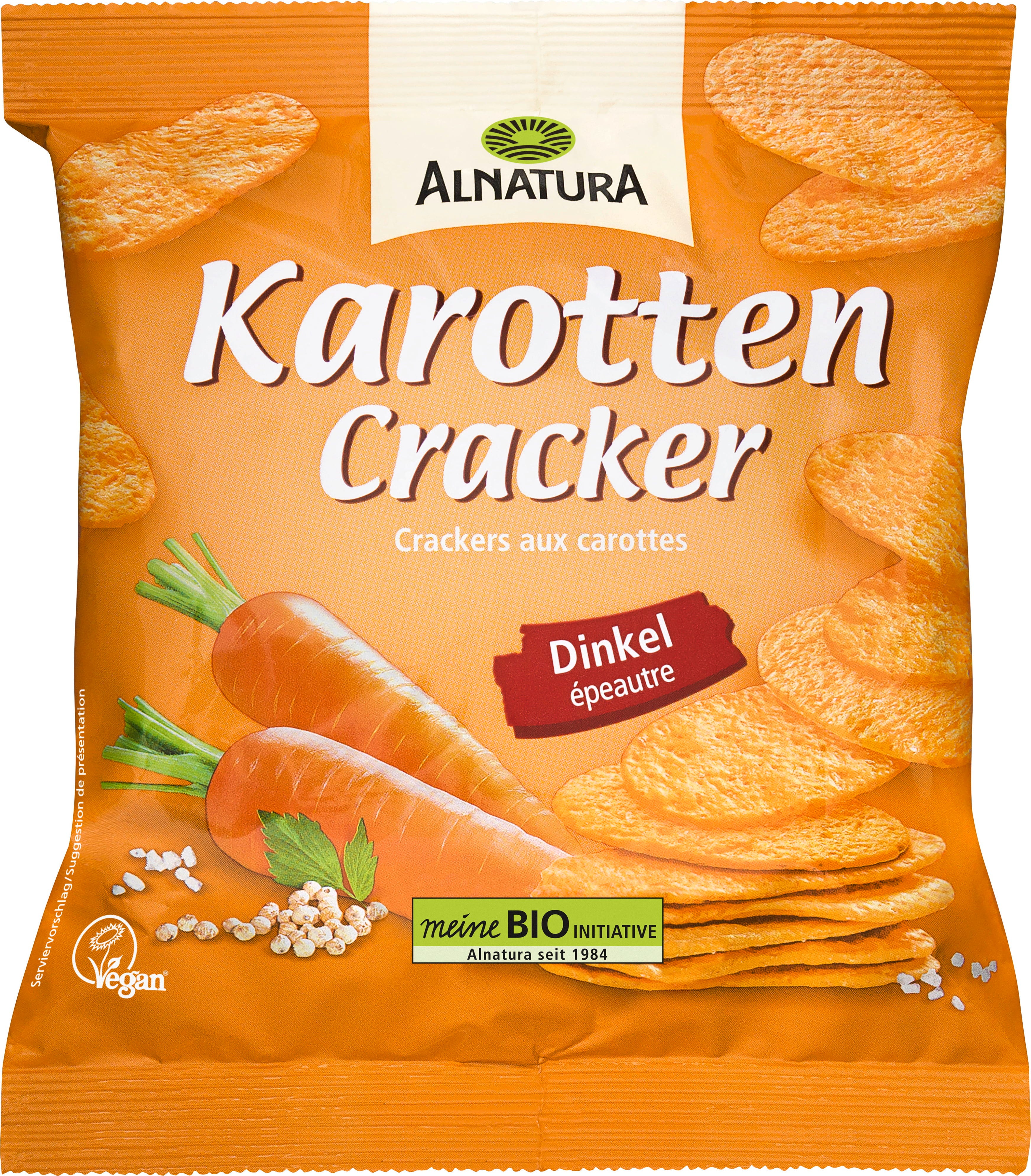 Der knusprige Alnatura Bio Cracker Karotten begeistert durch seine vegane Rezeptur. Die Basis bilden Dinkelmehl und -schrot. Karottensaft sorgt für die feine Gemüsenote. Abgerundet mit Kräutern und Gewürzen.