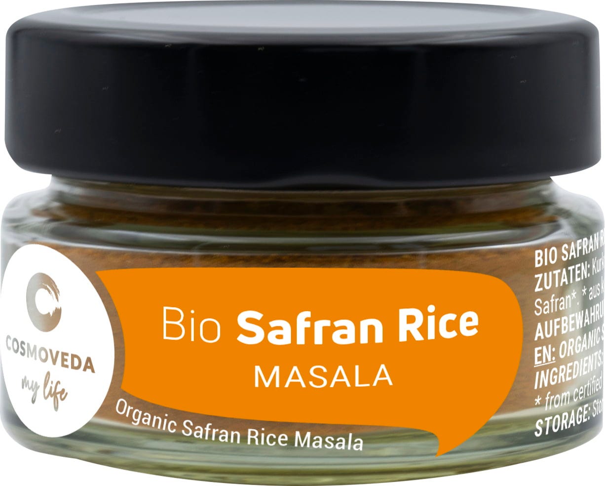 COSMOVEDA BIO Safran Rice Masala ist eine spezielle ayurvedische Mischung erlesener Gewürze, die Ihnen einen köstlichen Safran Reis zaubern lässt.