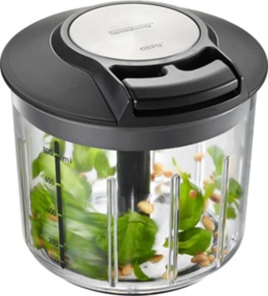 Das Geheimnis seiner Effizienz liegt im manuellen Seilzugmechanismus und dem ergonomischen Griff: Mit nur wenigen Zügen zerfällt dein Schneidgut von grober bis hin zu sehr feiner Konsistenz – je nachdem, wie lange du den Mechanismus betätigst. Zwei extrem scharfe, geschwungene Klingen aus japanischem Klingenstahl sorgen für optimale Resultate, während Rillen im transparenten 800-ml-Behälter das Schnittgut immer wieder nach unten führen. Dank des formstabilen Schleuderkorbs und des Rühr-Einsatzes hast du für jede Aufgabe den richtigen Aufsatz, die sich einfach austauschen lassen.