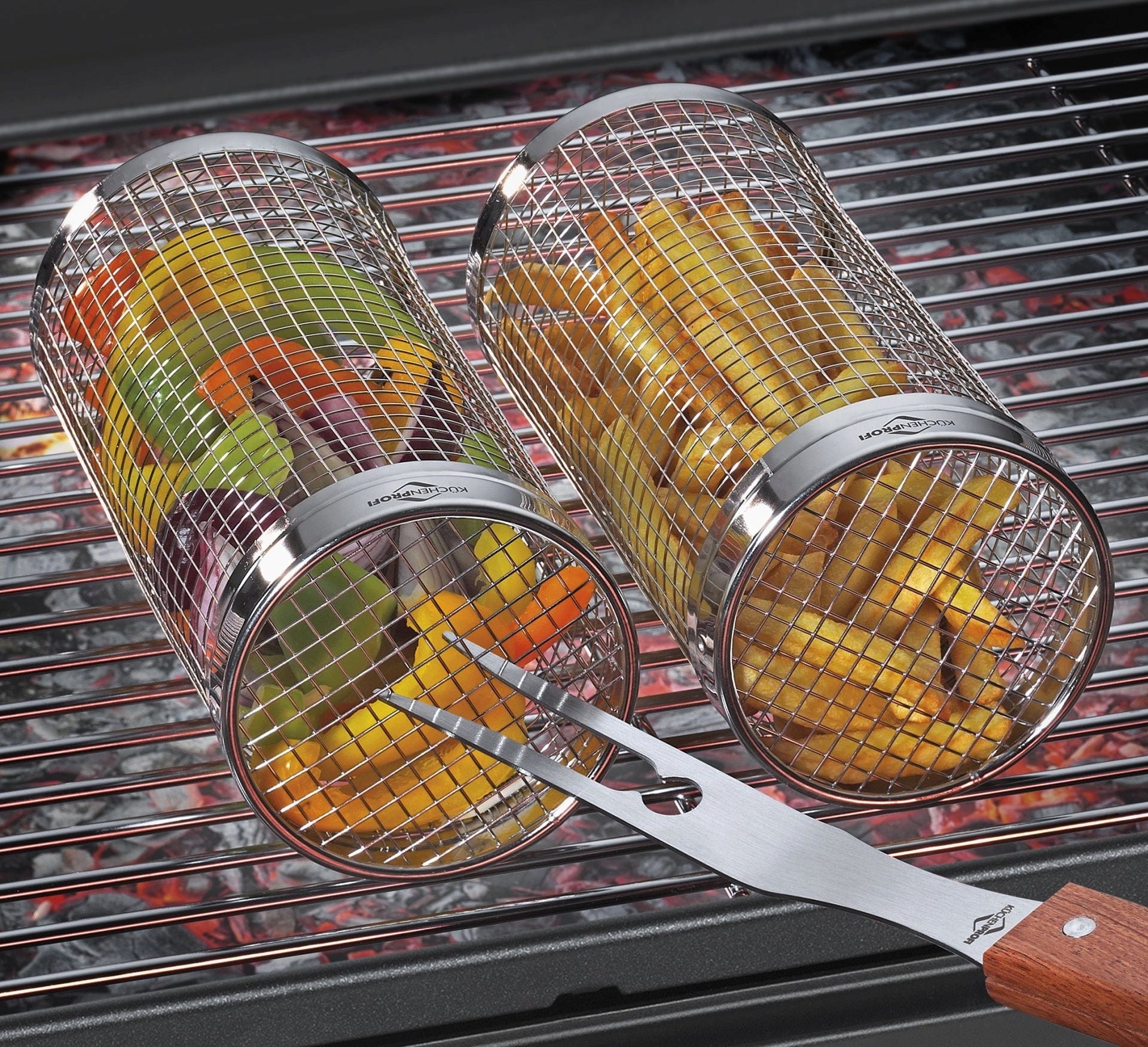 Egal ob Gemüse, Garnelen, Pommes oder Fleischbällchen - im praktischen Grillkorb RONDO von Küchenprofi wird sogar kleinstes Grillgut gleichmäßig gegart, ohne zwischen dem Grillrost hindurchzufallen. Einfach den Korb wenden & genießen.