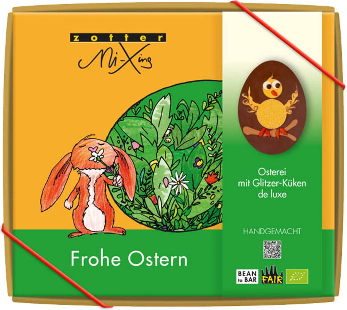 Erfahrungsberichte in Deutsch für Zotter Schokoladen Bio MiXing Osterei mit Glitzer-Küken de Luxe