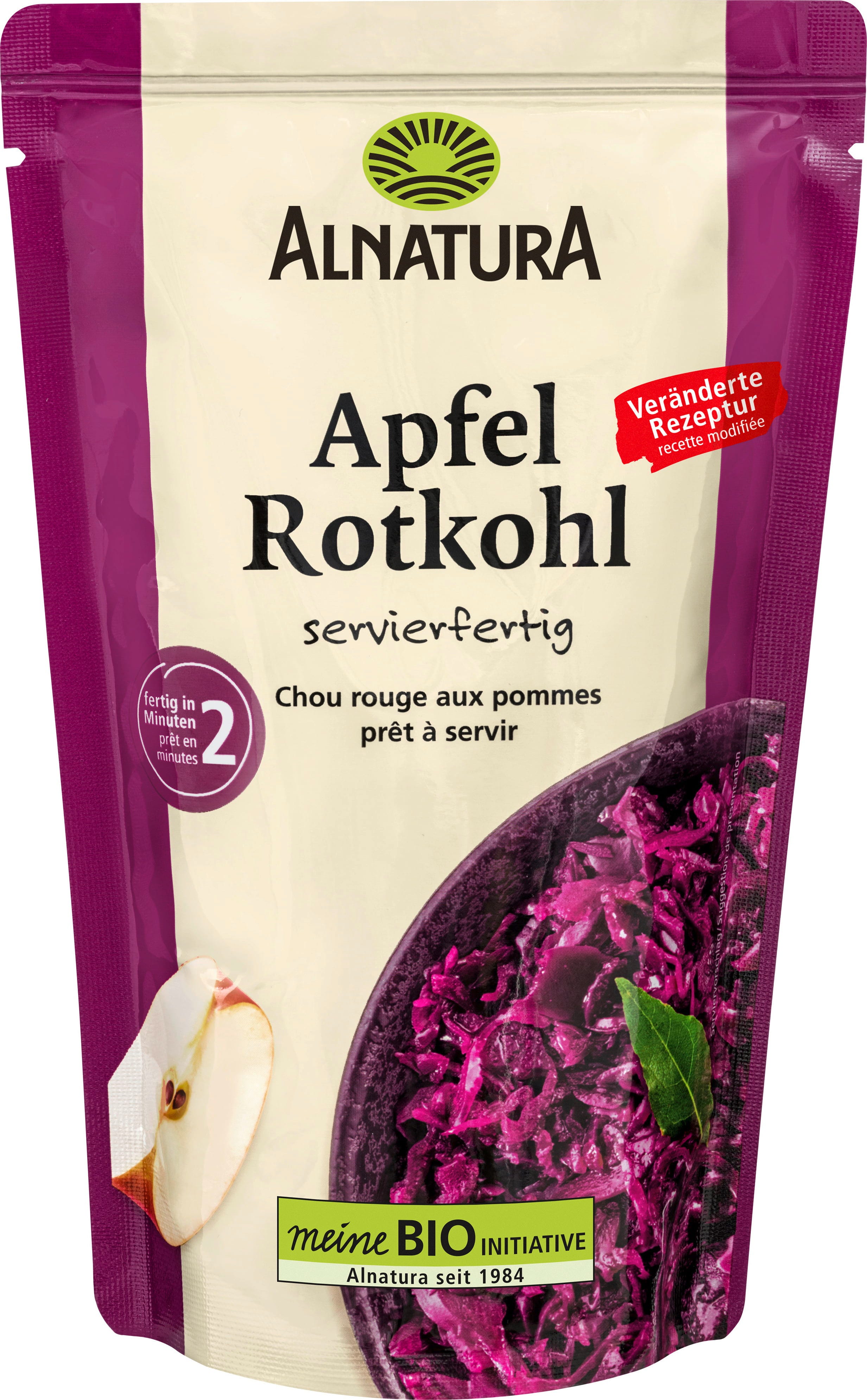 A finely seasoned side dish ready in just 2 minutes. Apple Red Cabbage by Alnatura is prepared using fresh red cabbage and apples. Its fruity notes make it the perfect accompaniment to hearty meals. This recipe is vegan.
