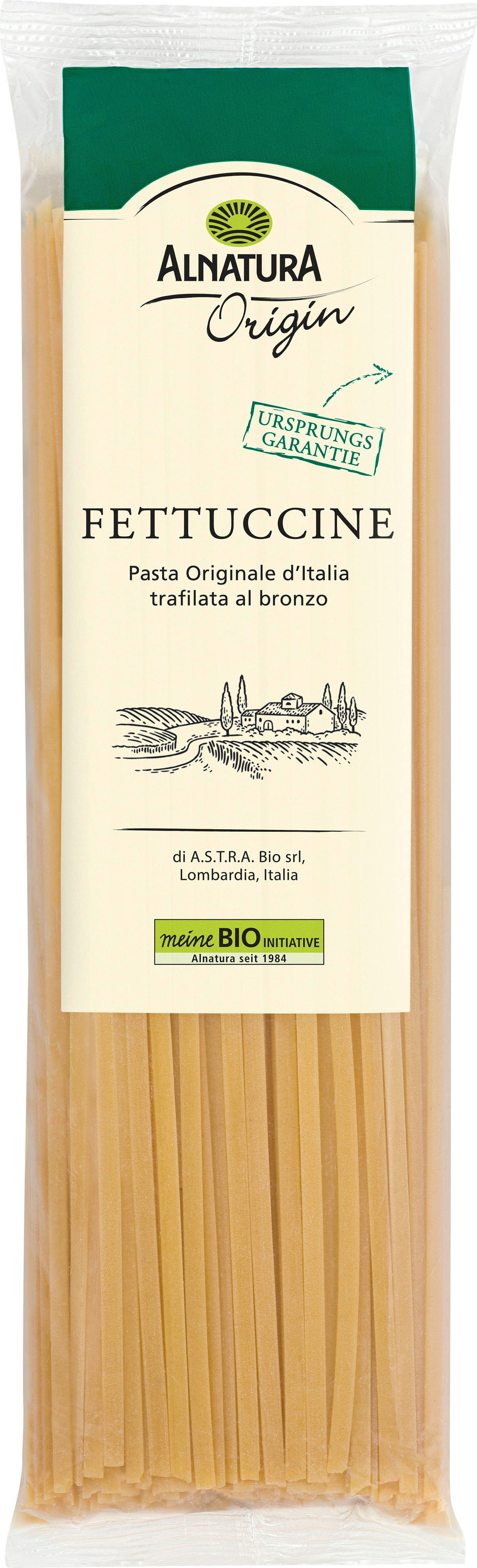 Alnatura Bio Origin Fettuccine are long pasta ribbons with a width falling right between linguine and tagliatelle. They are excellent with creamy or chunky sauces. Crafted using traditional bronze dies, they feature a rough surface that is particularly good at holding onto sauce. Made from 100% Italian durum wheat semolina.