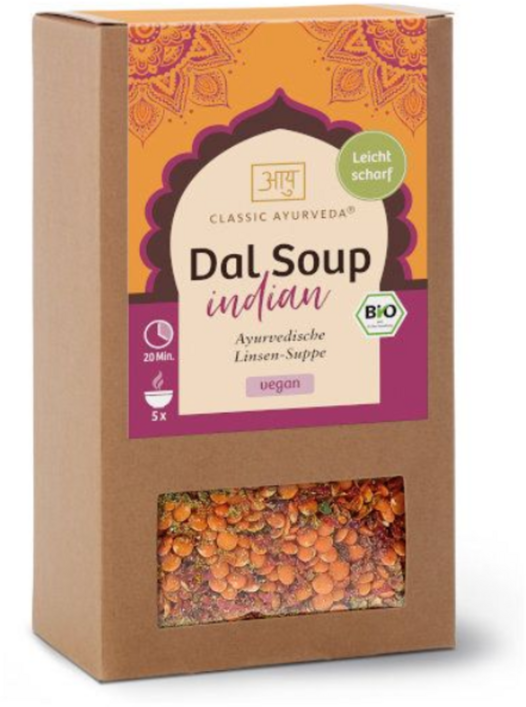 This organic Indian dal soup combines red lentils with finely balanced organic vegetables such as carrots, bell peppers and tomatoes. The recipe is rounded off by a selection of Ayurvedic spices including cumin, turmeric, ginger and coriander leaves, which provide a slightly spicy note. The mixture consists of 100% natural ingredients and is completely free from added sugar or artificial additives. It is ideal as a light evening meal or as part of a conscious diet.