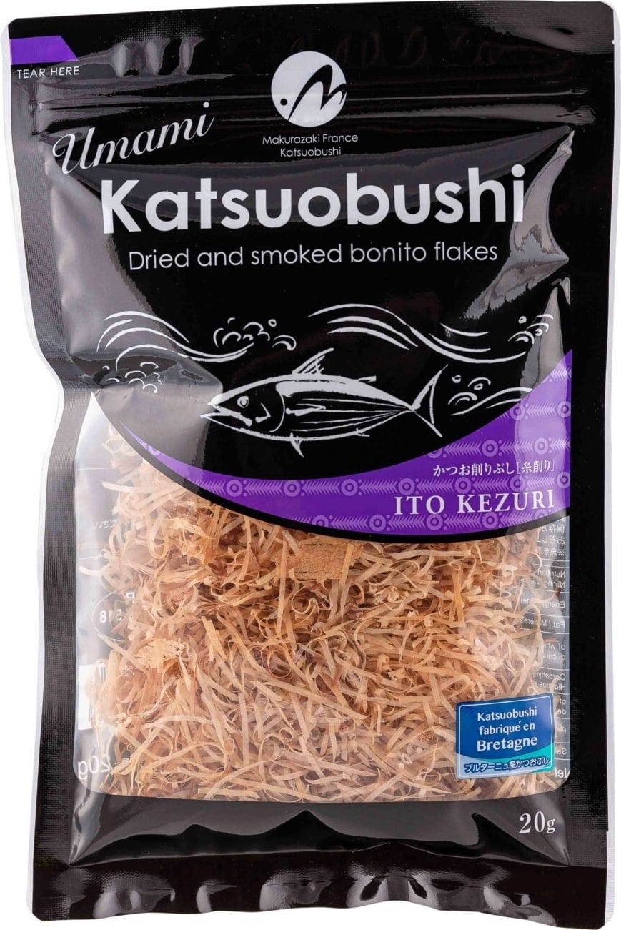 These very fine Katsuobushi flakes are painstakingly produced using traditional methods by a Japanese company in France. They are boiled, then smoked and dried multiple times,giving them an intense umami flavour which is essential for Japanese cuisine. The bonito flakes are perfect as a topping for dishes such as okonomiyaki, takoyaki, salads, or soups — and also for creative European cuisine.