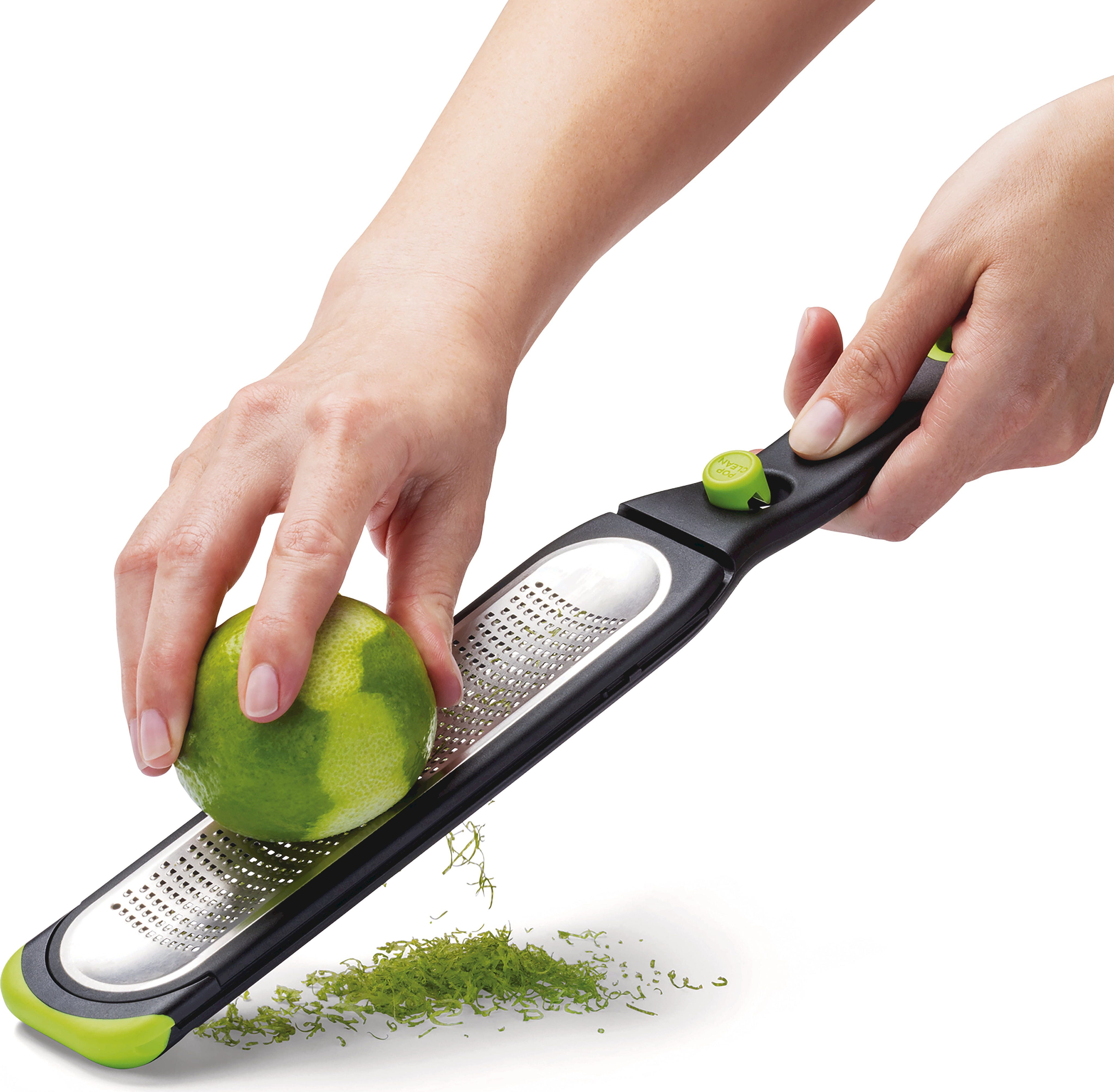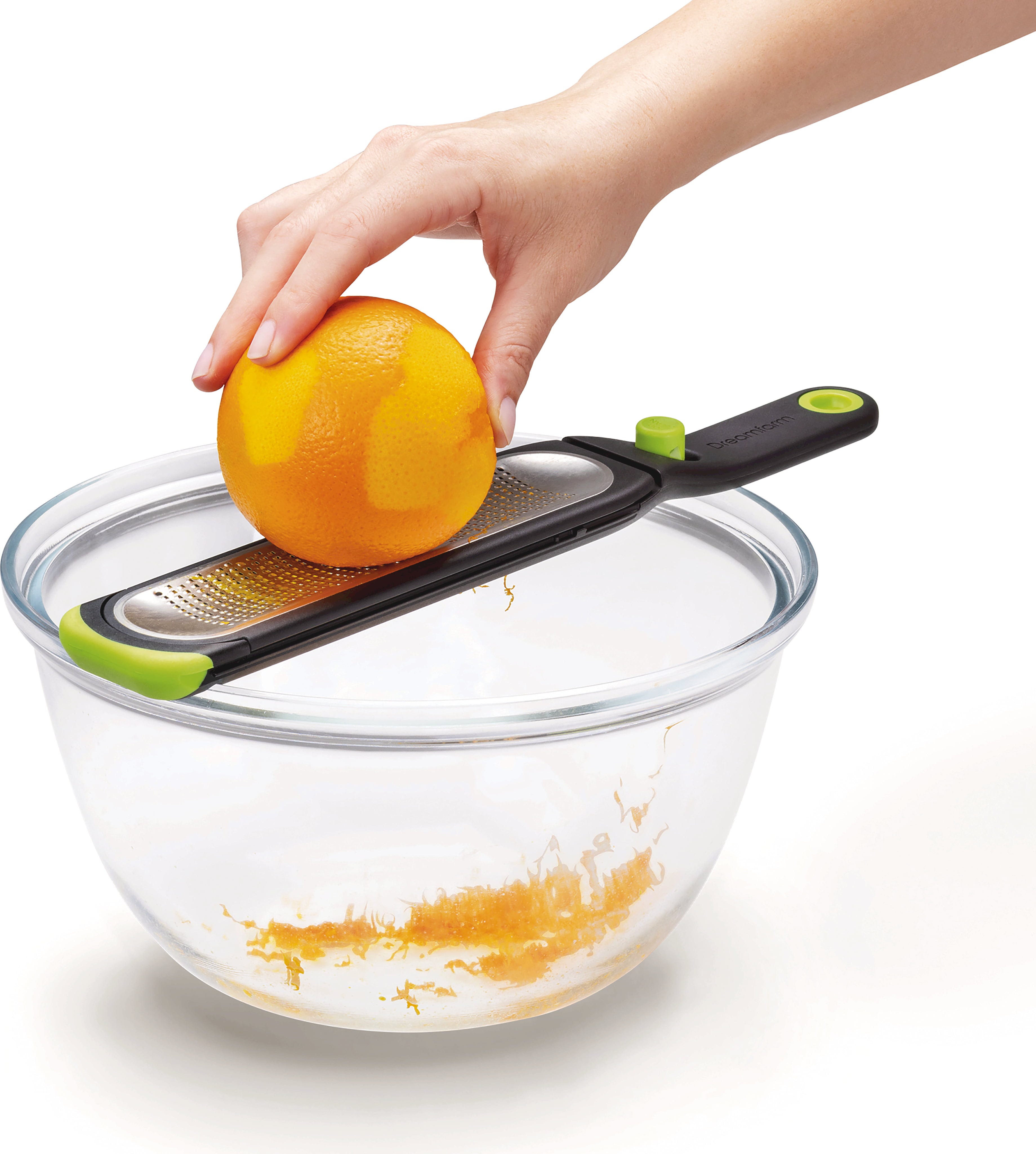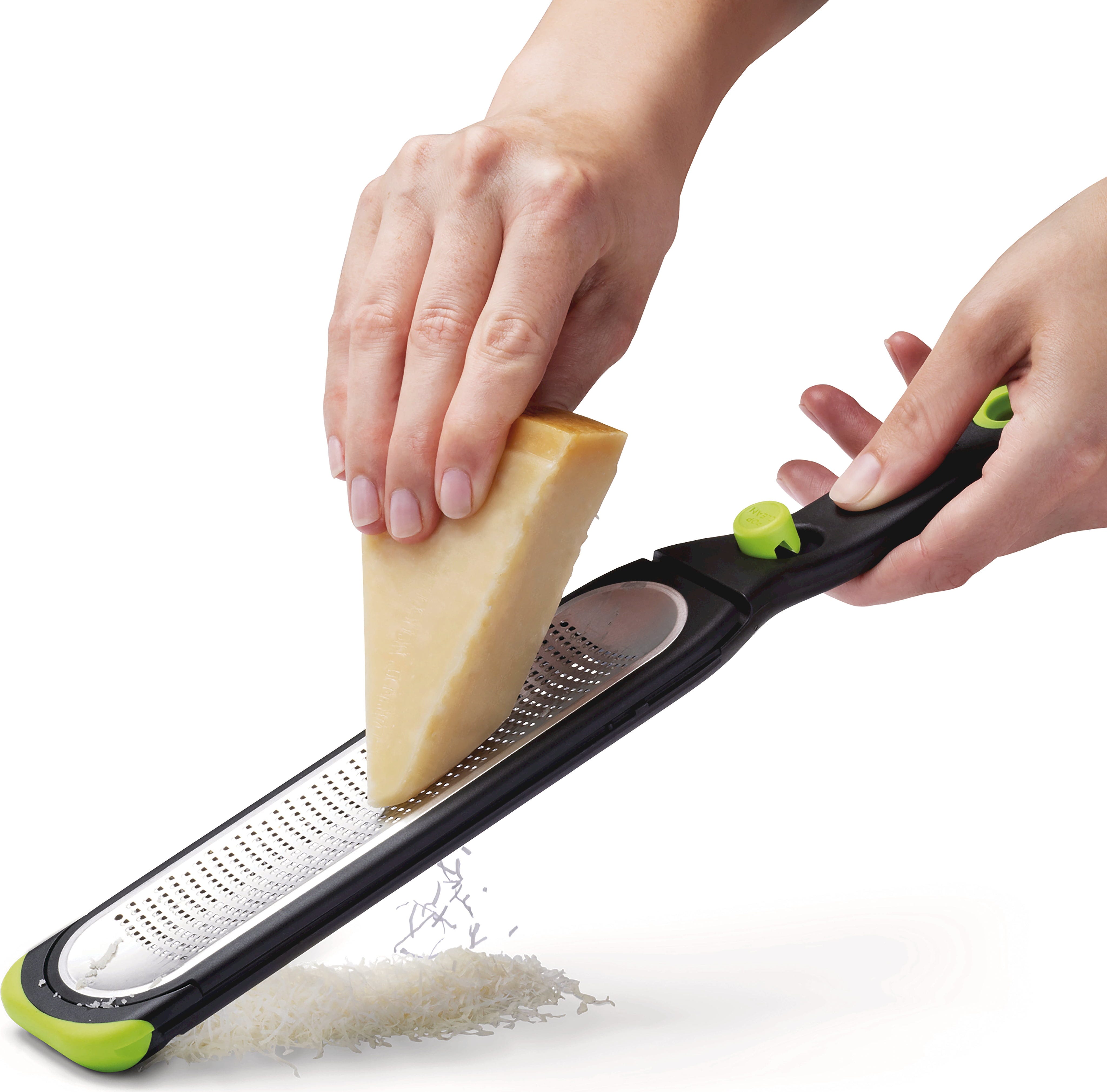 The standout feature is the innovative self-cleaning function: with a simple press of a button, the grating surface flexes, causing all the zest to fall away instantly so nothing gets trapped. It includes a practical protective cover that doubles as a collection container. Crafted from durable stainless steel and fully dishwasher-safe, this grater is the ideal choice for precision and efficiency in any kitchen!