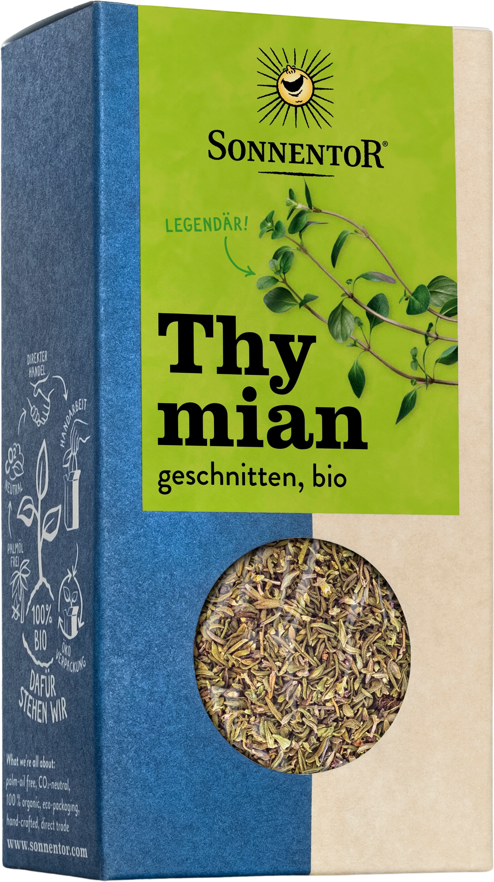 The earthy and peppery flavour has hints of anise, mint and camphor and provides Mediterranean dishes with their character. Thyme blends very well with onion, wine and beer. The intensely spicy, ethereal scent with a hint of pine needles is reminiscent of the Mediterranean. The hint of mint rounds off the fresh flavour of thyme.