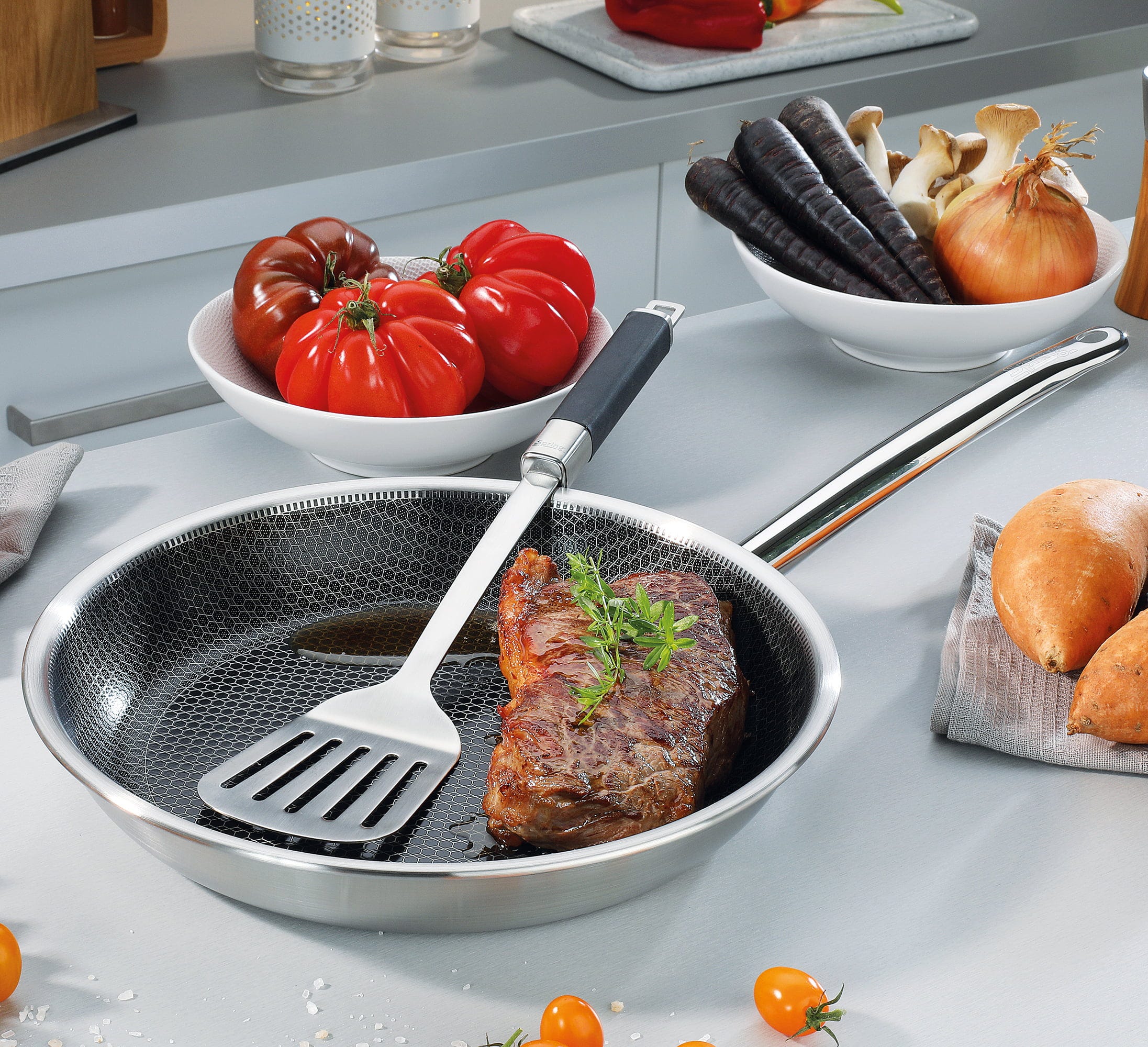 The Vulcano Cut Resist Pure Frying Pan by Spring is the perfect choice for anyone who doesn't want to compromise in the kitchen. The highlight of this pan is the innovative, raised, stainless steel honeycomb structure. It protects the mineral non-stick coating so effectively that you can even use metal spatulas without hesitation.