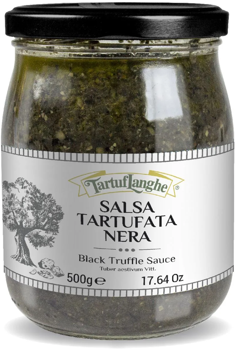 The Black Truffle Sauce by Tartuflanghe adds a rich, aromatic touch to canapés, sandwiches, flatbreads, pizza, pasta, as well as meat and fish fillets, vegetables, and eggs. The recipe is entirely free from preservatives.