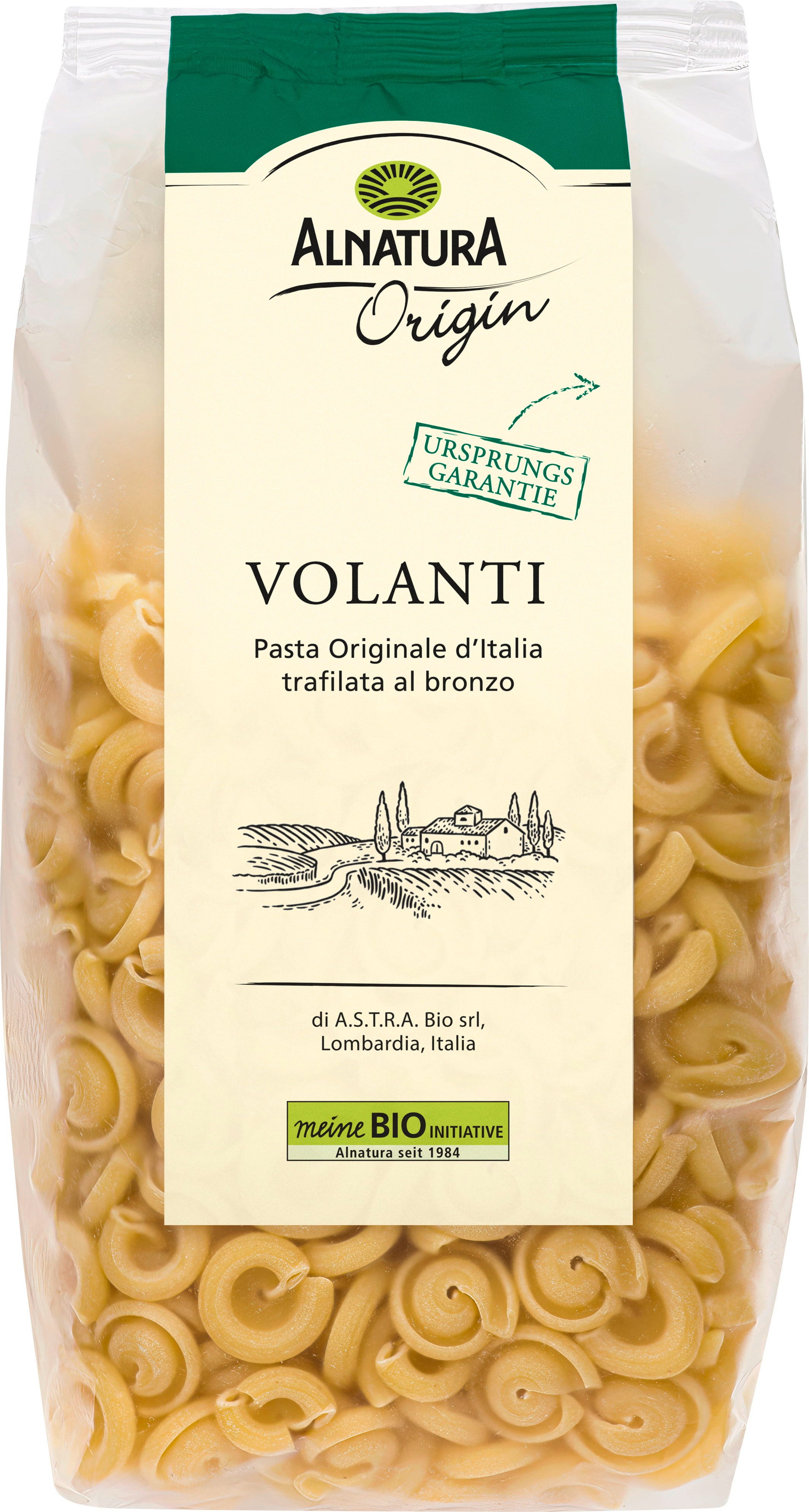 Les volanti bio de la gamme Origin de Alnatura, reconnaissables à leur forme en spirale, apportent à table toute la saveur des pâtes italiennes. Grâce au tréfilage au bronze, leur surface rugueuse retient parfaitement les sauces. Idéales pour les plats au four et les salades de pâtes. Produites par le partenaire A.S.T.R.A. avec 100 % de semoule de blé dur bio italien provenant de Lombardie.