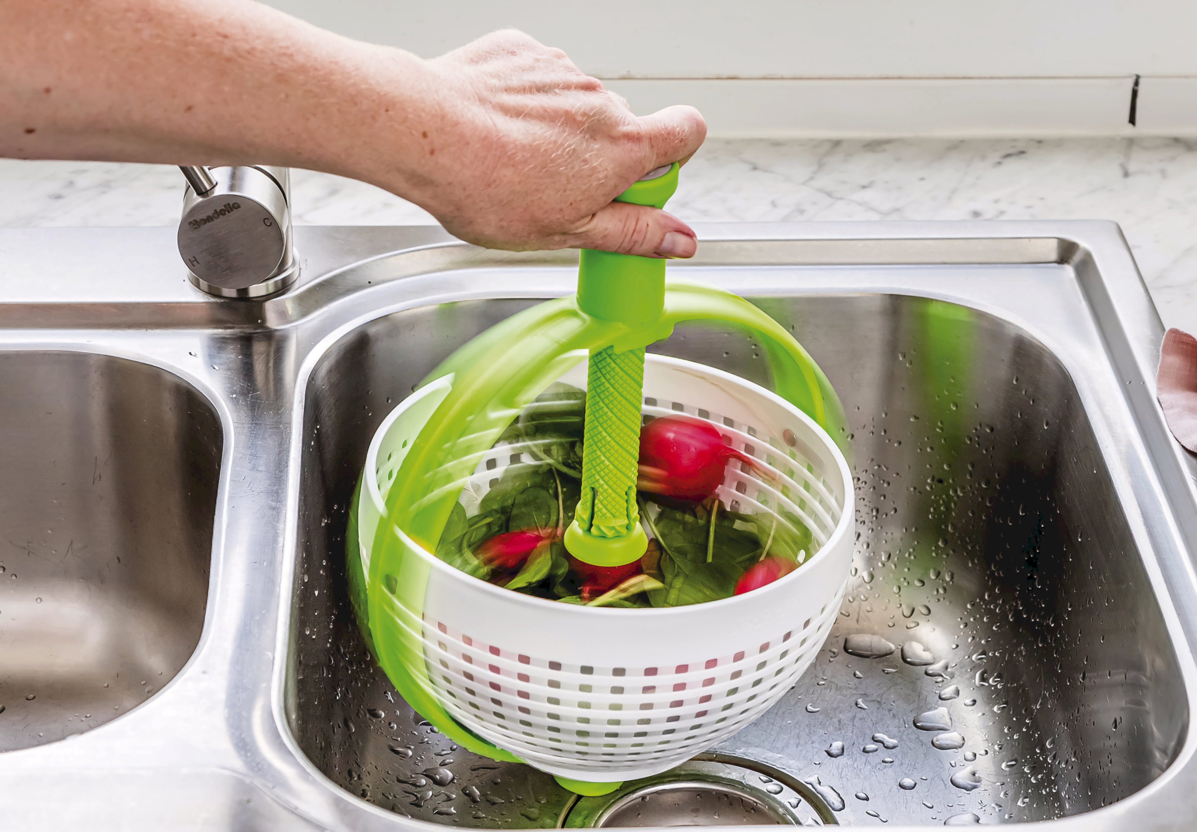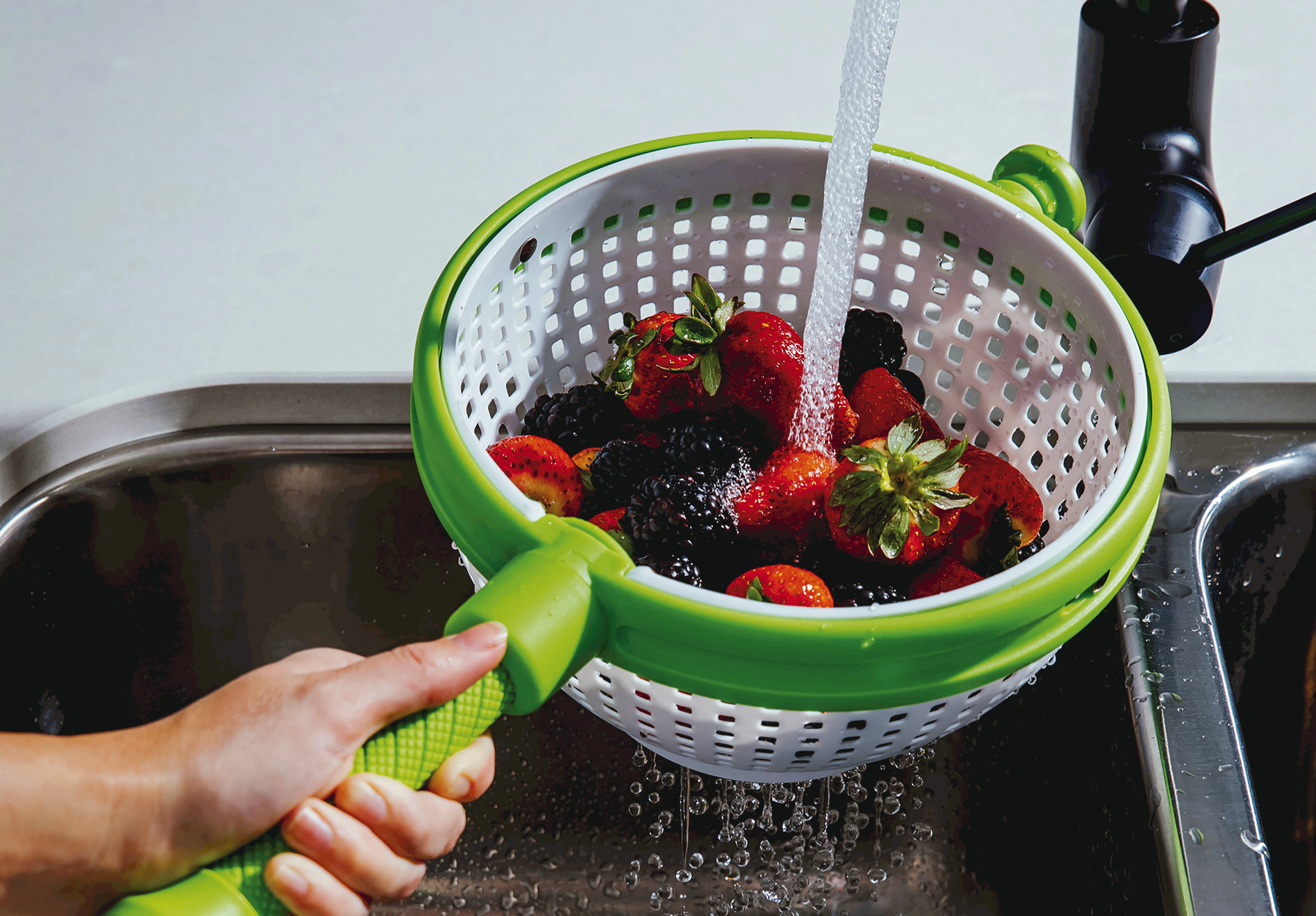 Avec l’essoreuse à salade Spina de Dreamfarm, vous disposez d’un ingénieux ustensile 2-en-1 qui combine parfaitement passoire et essoreuse. Grâce à sa base antidérapante, il est possible d’essorer rapidement salade, légumes ou fruits rouges directement dans l’évier, tandis que les bords surélevés maintiennent le contenu en toute sécurité dans le récipient.