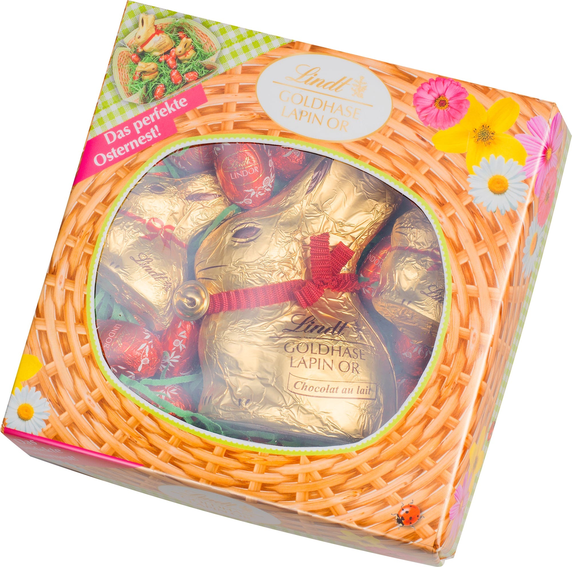 Un joli nid de Pâques qui cache sur une couche d'herbe verte, 3 adorables lapins et de délicieux œufs en chocolat Lindor. Les petits et grands gourmands seront ravis !