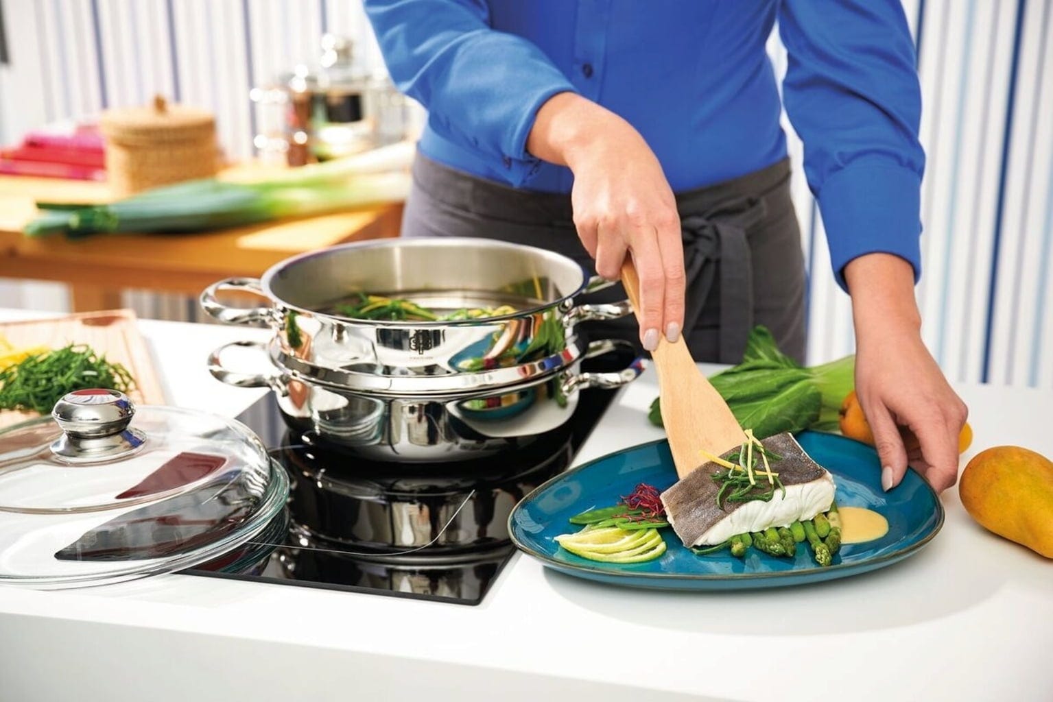 Casserole, cuiseur vapeur et couvercle : ce trio de qualité supérieure ne doit manquer dans aucune cuisine bien équipée. Facile à entretenir et économe en énergie grâce à l'acier inoxydable et au fond spécial en cuivre protherm®. Ce dernier garantit en outre au cuit-vapeur de pouvoir être utilisé sur toutes les plaques de cuisson courantes.