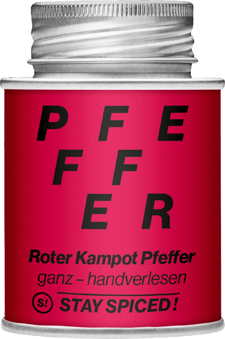 Le véritable poivre rouge du Cambodge, c'est-à-dire non coloré, est considéré comme l'un des meilleurs poivres au monde et fait partie des variétés les plus rares et les plus prisées. Pour le poivre rouge de Kampot de Stay Spiced! les grains de poivre sont récoltés à la main, séchés au soleil puis sélectionnés un à un. Seule la meilleure qualité est autorisée ici.