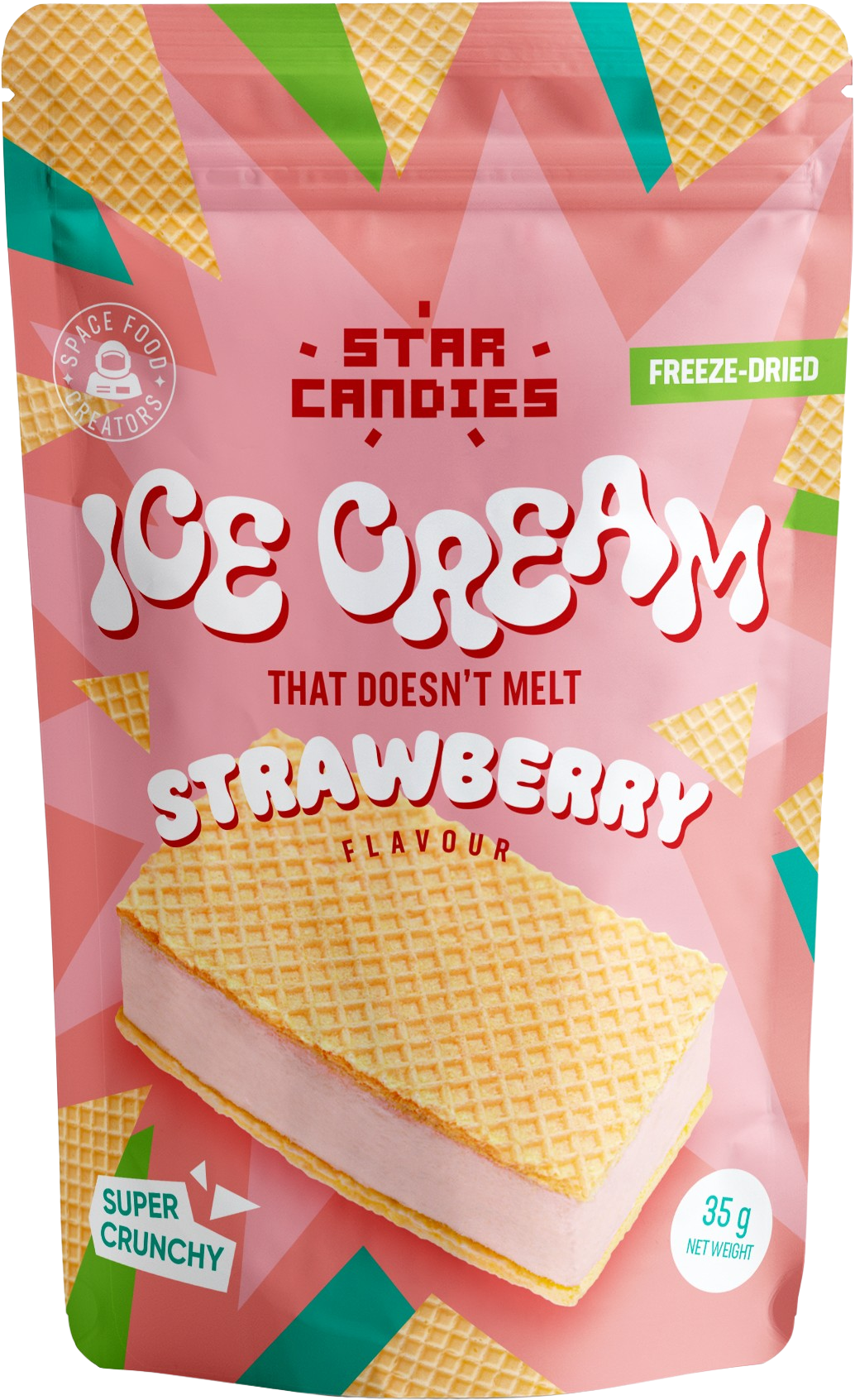 Découvrez la glace lyophilisée STAR CANDIES saveur biscuit glacé à la fraise de Super Garden. Un dessert innovant qui ne fond pas : imaginez tout le goût de votre classique sandwich glacé à la fraise, mais toujours croquant et prêt à déguster, sans besoin de congélateur.