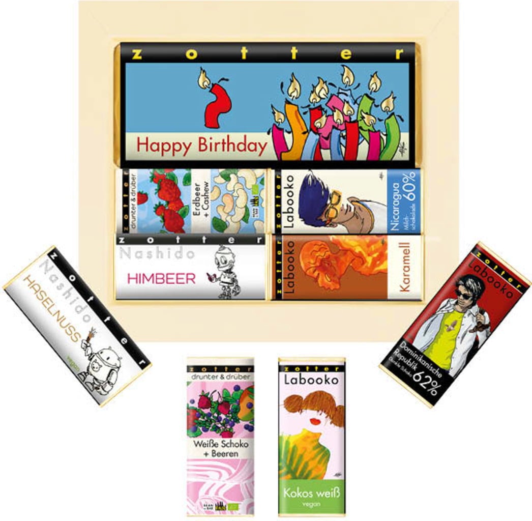 Ce mix de Zotter réunit neuf délicieuses spécialités chocolatées qui raviront tous les gourmands. Une sélection variée, parfaite pour célébrer un anniversaire avec style.