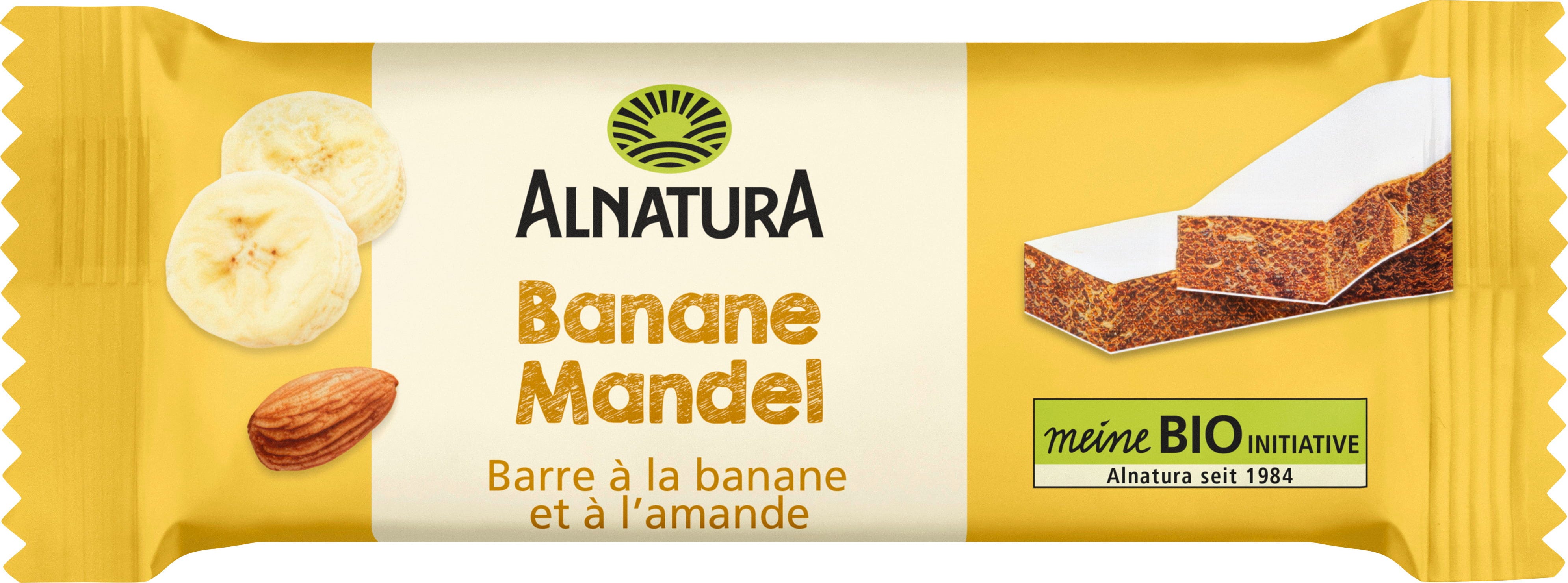 La Barretta Bio - Banana e Mandorla di Alnatura conquista con il suo gusto aromatico. Arricchita con mandorle e miele, è ideale come snack o da portare con sé. La cialda esterna evita di sporcarsi le mani.