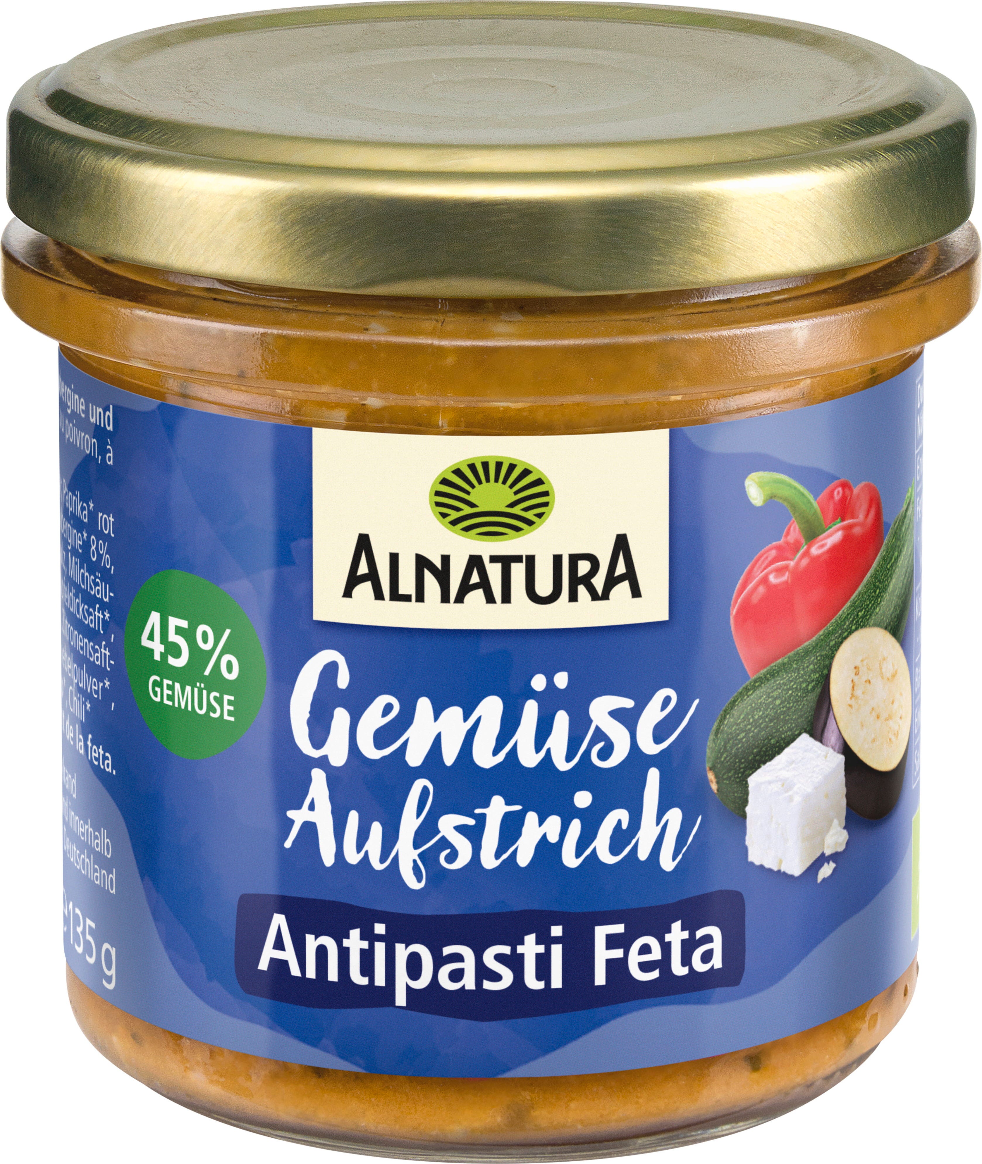 17 % zucchine[1], pasta di pomodoro concentrata [1], acqua, 10 % peperone rosso, olio di semi di girasole[1], semi di girasole[1], 8 % melanzana[1], 6 % pomodori[1], 4 % Feta[1] (latte di pecora[1], sale marino, colture di batteri lattici, caglio microbico), 3,8 % cipolla[1], succo di mela[1], amido di mais[1], sale marino, aceto di mele[1], aglio[1], succo di limone concentrato[1], basilico[1], paprika dolce[1], cipolla in polvere[1], pepe nero (Piper nigrum)[1],