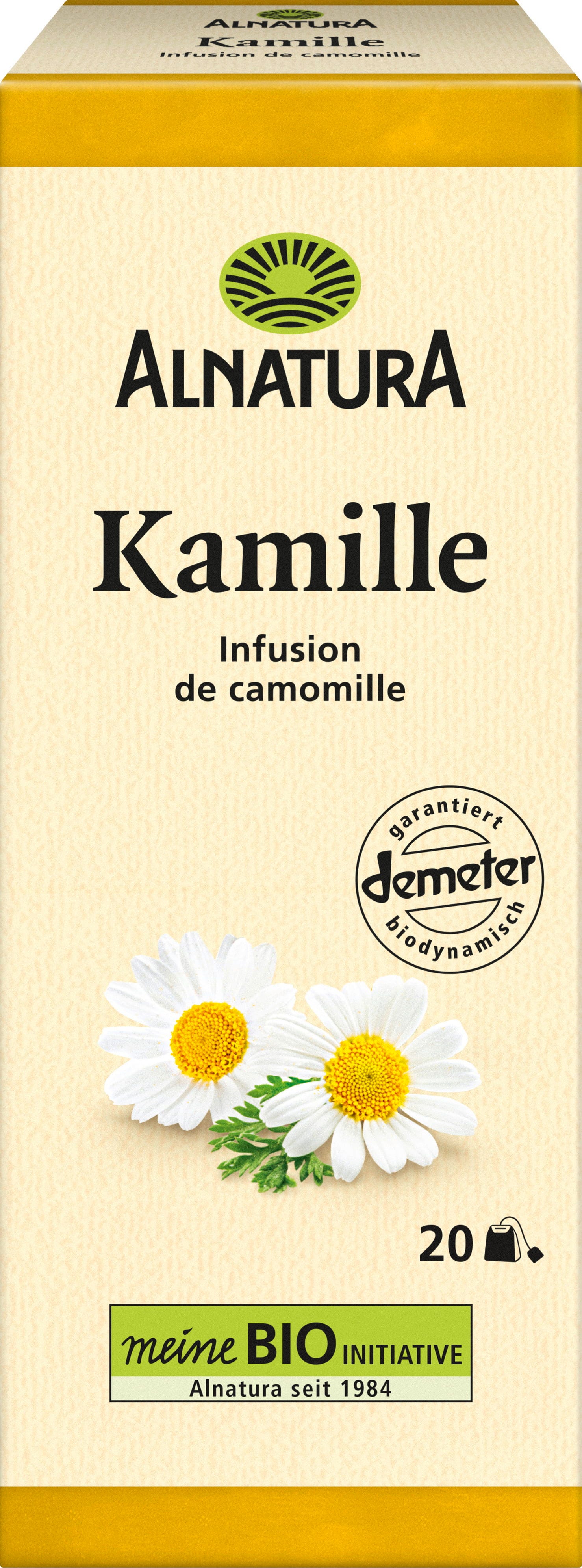 La Tisana Bio - Camomilla di Alnatura si distingue per il suo aroma delicato. I fiori biologici utilizzati sono coltivati secondo gli standard Demeter.