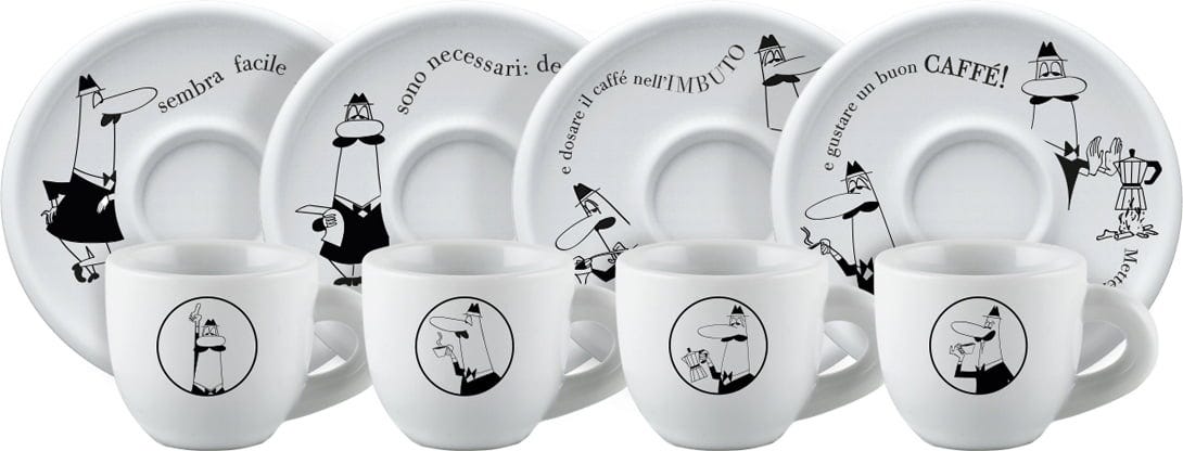 Le tazzine da caffè e i piattini di questo set sono decorate con l'iconico omino Bialetti e con la storia della preparazione del caffè con la Moka Express.
