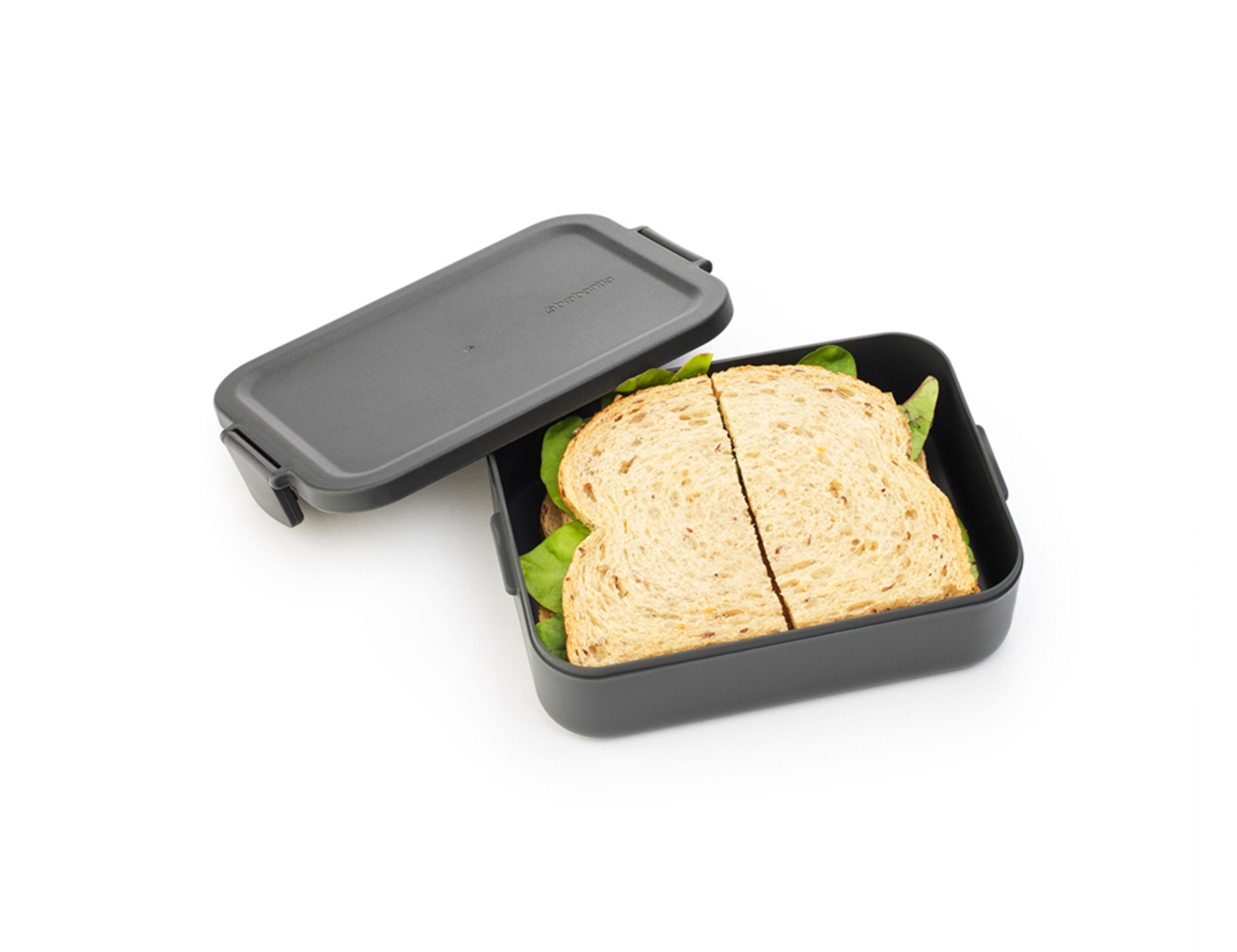 Dì basta alla plastica monouso e scegli una soluzione sostenibile con questa ampia lunch box della serie Make & Take di Brabantia. Questo pratico e capiente contenitore da 2 litri è perfetto per trasportare in sicurezza sandwiches, tortillas o panini, grazie al coperchio con chiusura a clip. È ideale per gustare il tuo pranzo ovunque, a scuola, in ufficio o in viaggio, ed è pensato per durare nel tempo: resistente, facile da pulire (anche in lavastoviglie) e adatto sia al microonde che al congelatore.