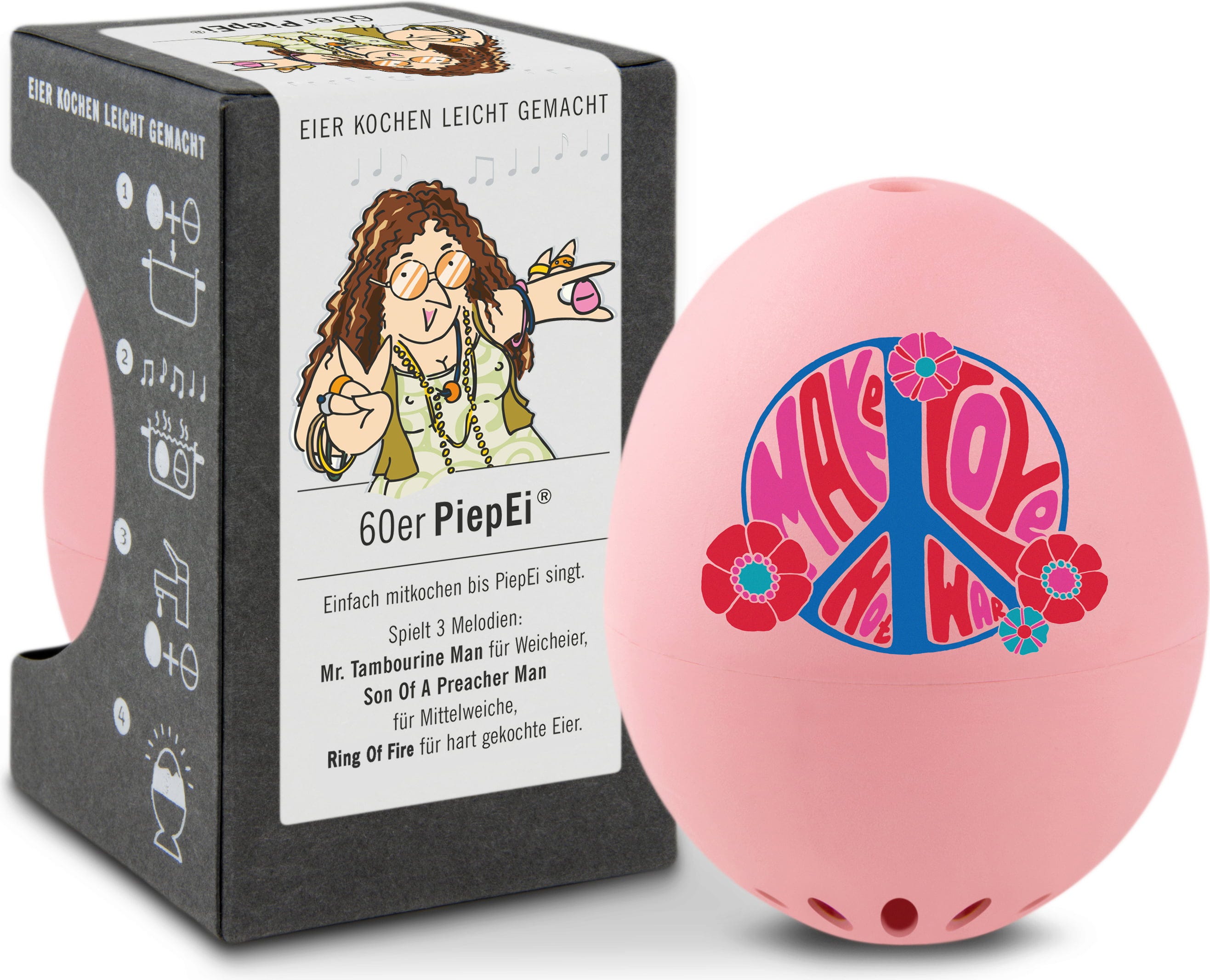 Basta inserire il PiepEi - Anni '60 insieme alle uova in pentola e attendere che suoni la melodia corrispondente al grado di cottura desiderato. Funziona indipendentemente dalla temperatura iniziale dell'acqua, dalla dimensione delle uova e dall'altitudine.