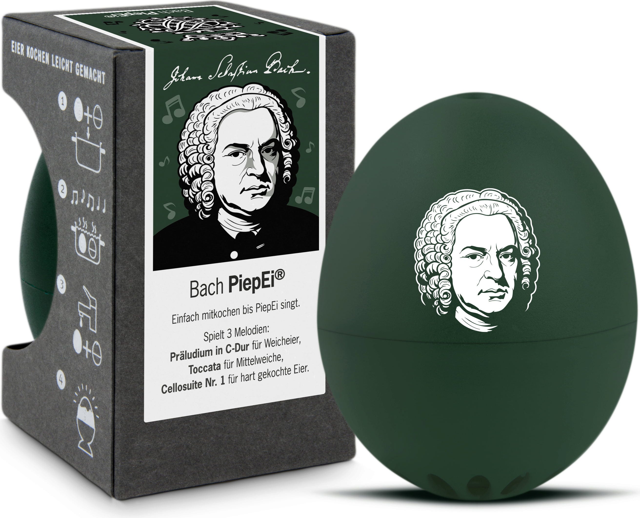Basta inserire il PiepEi - Bach insieme alle uova in pentola e attendere che suoni la melodia corrispondente al grado di cottura desiderato. Funziona indipendentemente dalla temperatura iniziale dell'acqua, dalla dimensione delle uova e dall'altitudine.