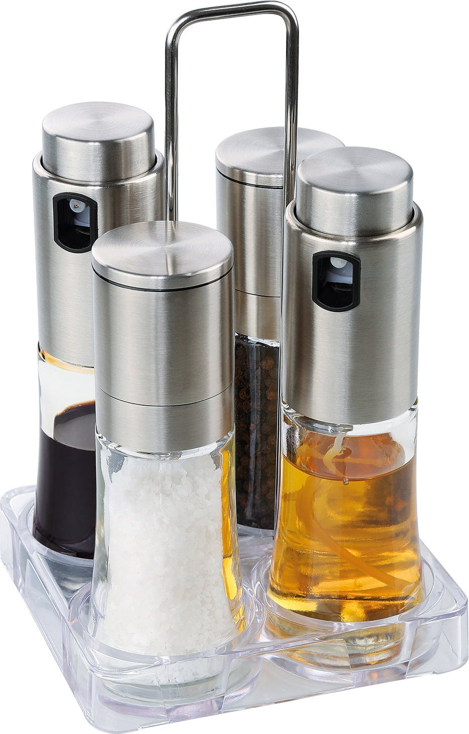 La menage BARI di cilio mantiene aceto, olio, sale e pepe sempre a portata di mano, presentandoli in modo ordinato ed elegante sulla tavola. Le bottiglie in vetro trasparente valorizzano splendidamente i colori naturali dell'olio d'oliva dorato e del balsamico scuro, invitando a condire secondo i propri gusti. Entrambi i macinini sono dotati di macine in ceramica di alta qualità, regolabili in continuo.