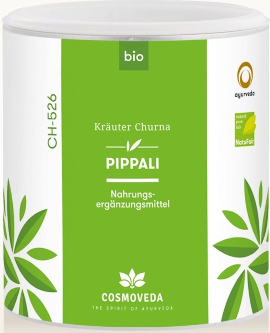 Pippali - Piper longum - è conosciuto anche come pepe lungo ed è una pianta aromatica con frutti da 2,5 - 3,5 cm di lunghezza e 5 mm di spessore di colore nero-verdastro. Nella dieta ayurvedica vengono utilizzate le radici e i frutti immaturi e maturi. La produzione avviene in modo delicato e lavorato a basse temperature (inferiore a 40 °C).