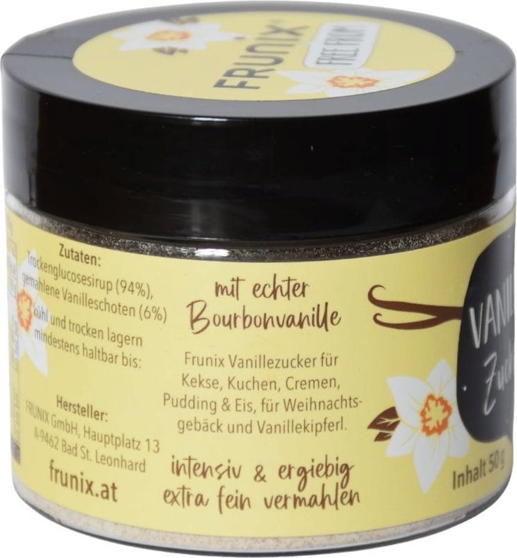 Biscotti, condimenti per macedonie, budini, torte: lo zucchero vanigliato FRUNIX®, con il 6% di vera vaniglia bourbon, dona a prodotti da forno, cibi e bevande un gusto davvero eccezionale! Grazie al sapore intenso, un cucchiaino di questo prodotto corrisponde a un intera bustina di zucchero vanigliato convenzionale. La confezione richiudibile protegge il prodotto dall'umidità, preservandone al contempo il sapore.