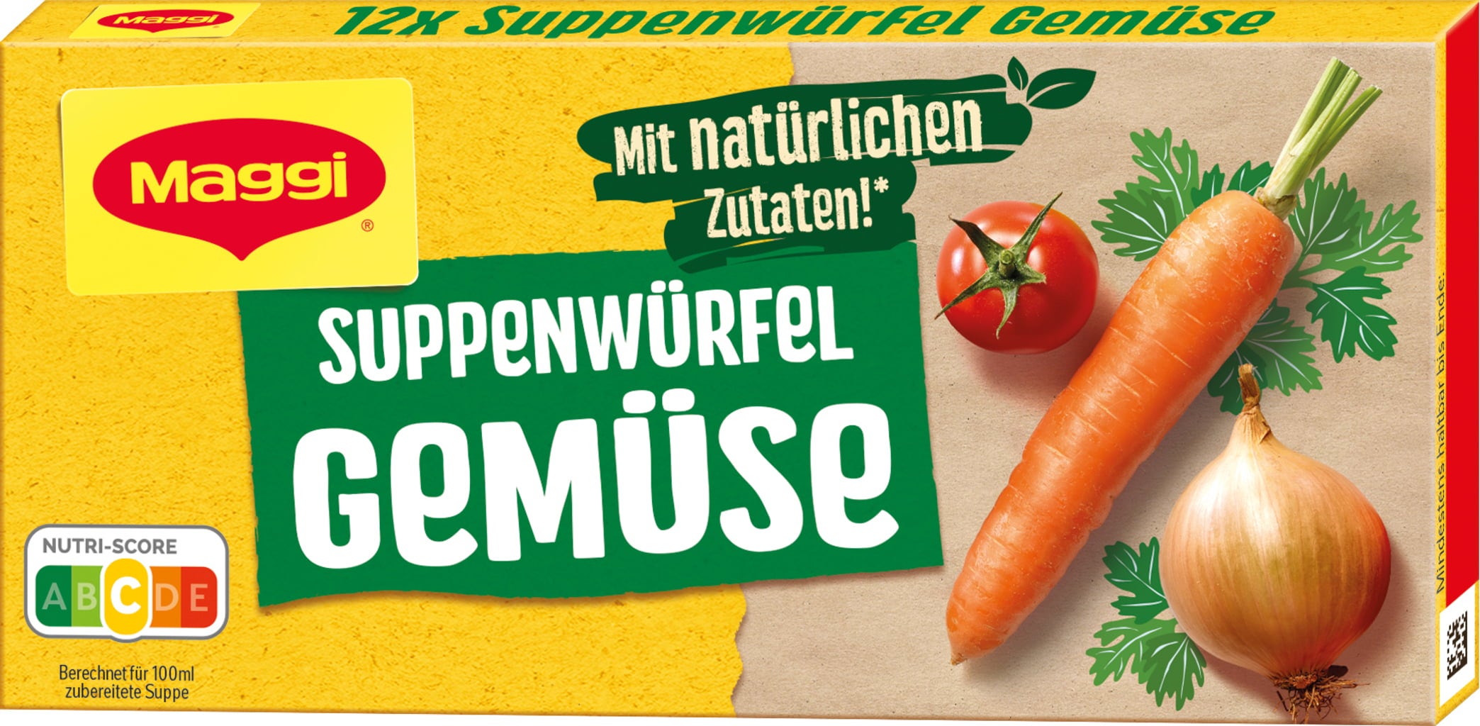 Con i dadi per brodo vegetale Maggi ottieni una bouillon di verdure armoniosa senza alcuno sforzo. Con cipolle, carote, porro, sedano e pomodori, i dadi donano ai tuoi piatti un aroma equilibrato e saporito che aggiunge profondità alle preparazioni. Perfetti per completare zuppe, piatti di verdure, stufati o ricette a base di pasta.