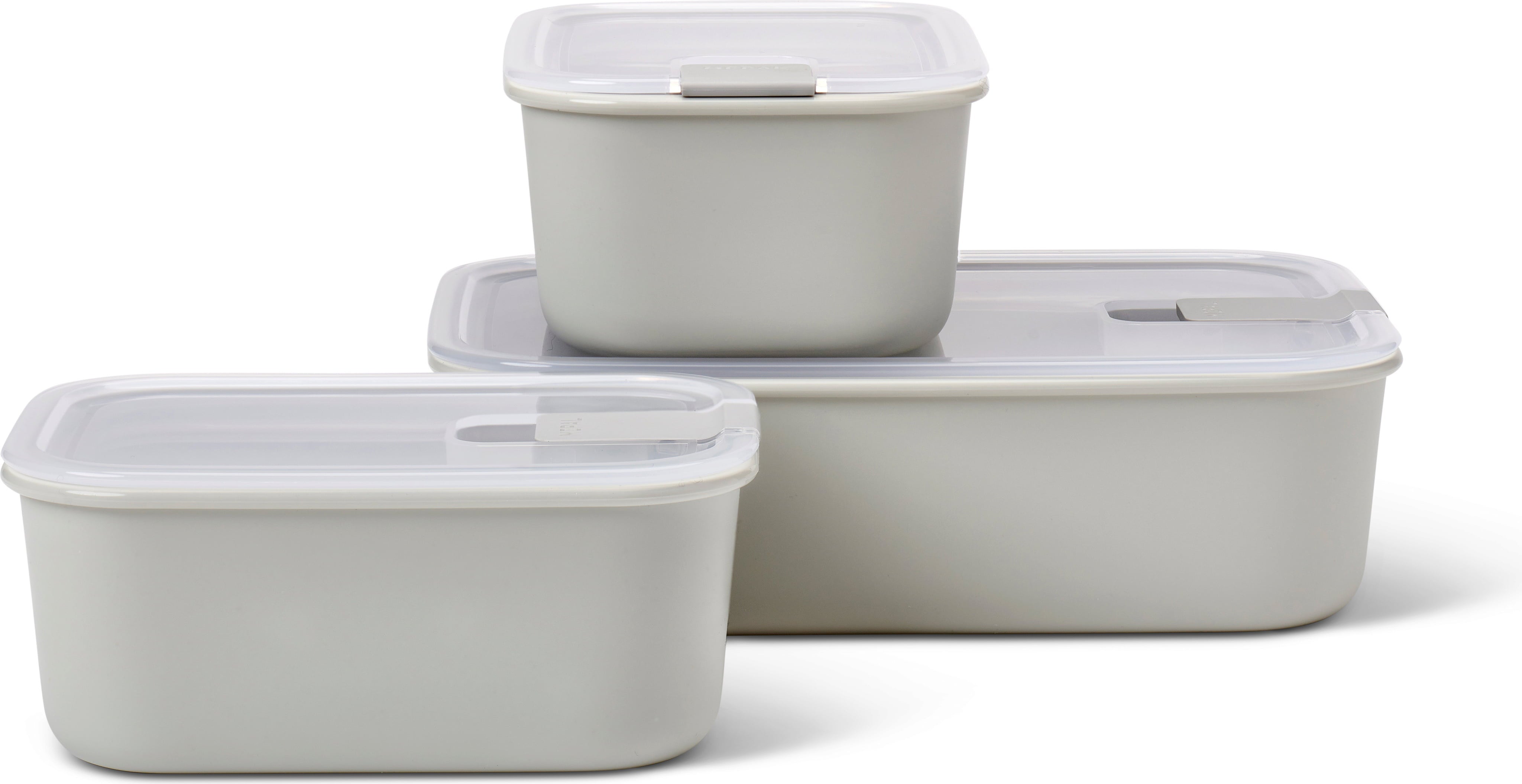 Il set di contenitori EasyClip di Mepal ti semplifica la vita quotidiana: che si tratti di insalate, pasta o avanzi del giorno prima, con un solo clic i tuoi alimenti sono conservati in modo sicuro. I contenitori sono impilabili e si adattano idealmente al frigorifero o al congelatore. Per un riscaldamento rapido nel microonde, basta aprire la valvola di aerazione integrata. Un sistema di conservazione ben studiato, pensato per la tua cucina.