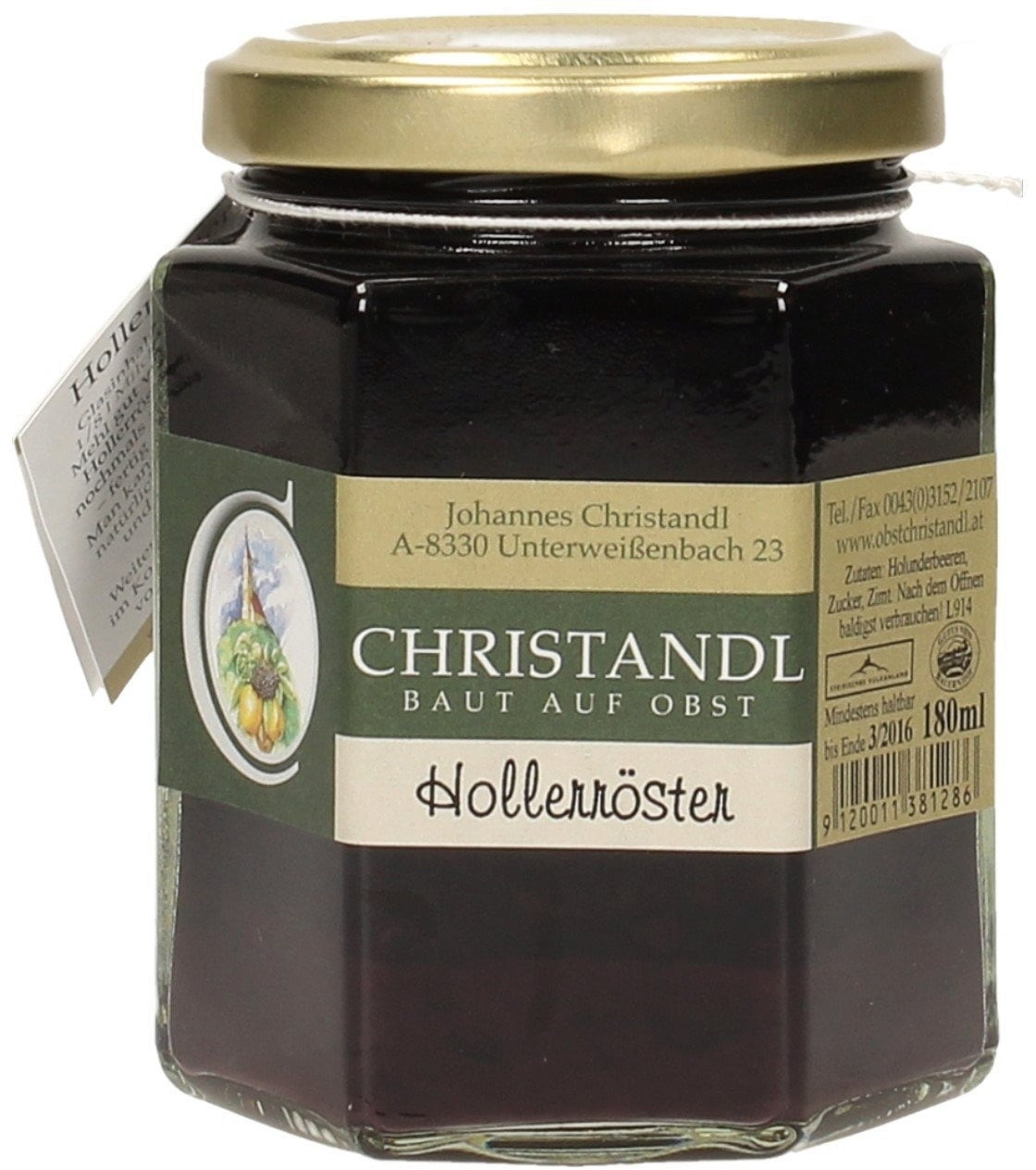 Questa speciale confettura, che in Austria viene chiamata "Hollerröster", è prodotta con bacche di sambuco, un po' di zucchero e cannella. Questa specialità è ideale per accompagnare alcuni dei dolci austriaci tradizionali, come gli gnocchi di ricotta (Topfenknödel) o un dolce a base di semolino chiamato Grißsmarren, ma anche per qualsiasi altra preparazione dolce. Provala anche semplicemente nello yogurt... è una vera bontà!