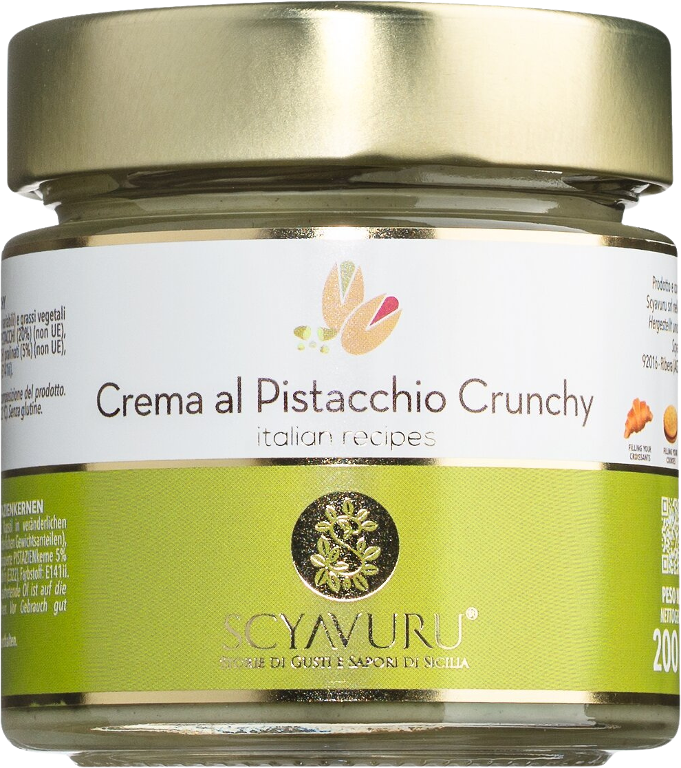 Una pregiata crema al pistacchio prodotta esclusivamente con pistacchi siciliani e arricchita con croccanti pezzetti di pistacchi caramellati. Ideale da spalmare su croissant e pane bianco, impreziosisce anche torte, biscotti e gelati oppure si sposa magnificamente con panettoni, colombe e pandori. Ingredienti di alta qualità e una lavorazione delicata garantiscono un piacere unico dal sapore puro e autentico.
