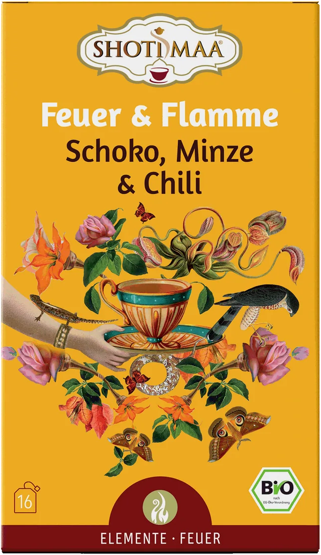 Vivi un affascinante gioco di contrasti con questa ricetta Shoti Maa, in cui le bucce di cacao incontrano la menta piperita. La profondità intensa del cacao e la freschezza della menta sono arricchite da una nota mirata di peperoncino, che dona una piacevole intensità. Completata da anice, finocchio e un delicato accenno di petali di rosa, questa composizione si ispira all'elemento fuoco. Ogni sorso di questa miscela biologica accompagna nei momenti di cambiamento, sostenendo la presenza e una nuova energia nel portare avanti le proprie intenzioni.
