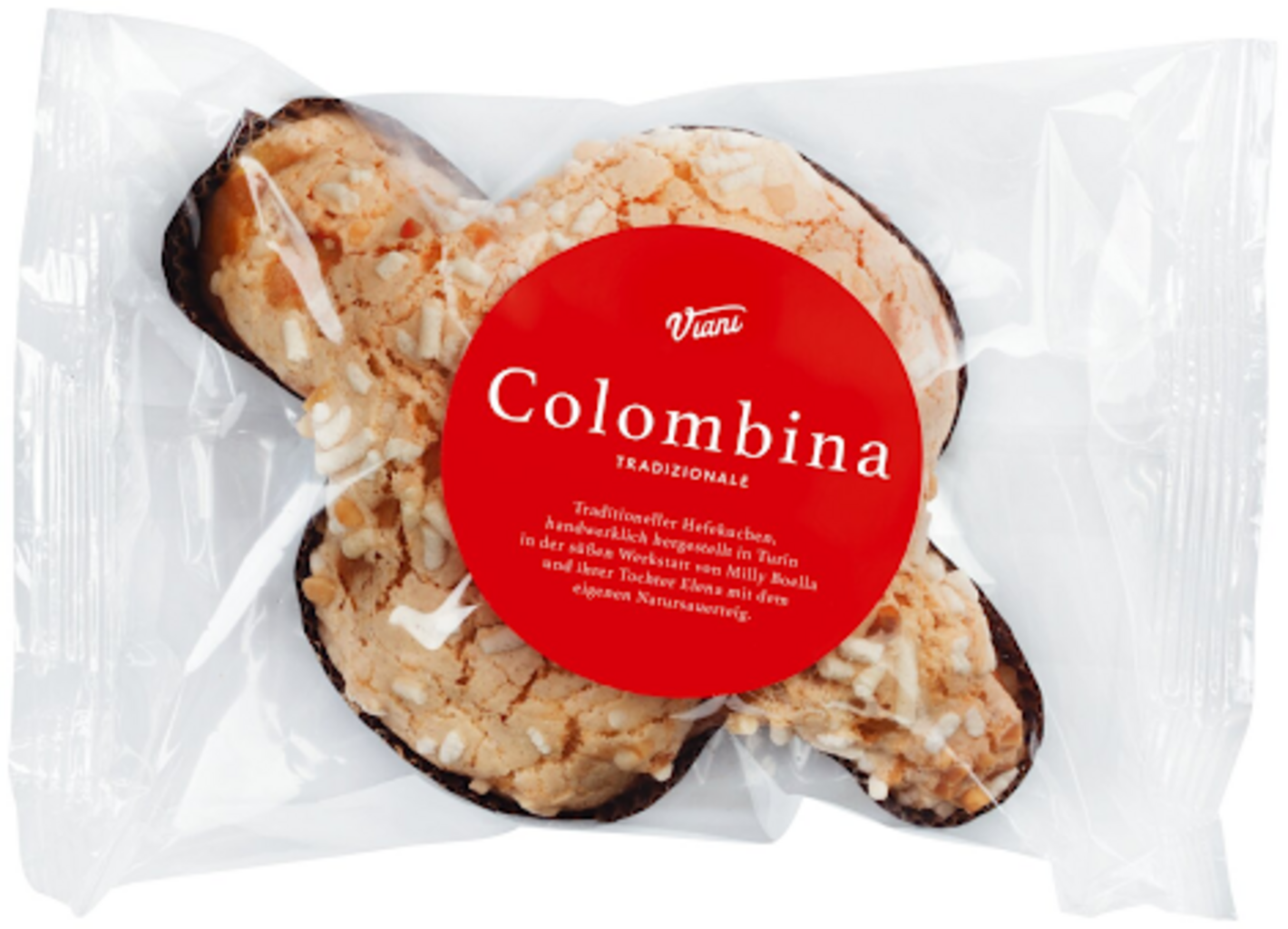 La Colombina di Viani viene prodotta secondo ricetta tradizionale. Il morbido impasto lievitato è arricchito con scorze d'arancia candite, mentre la decorazione è composta da una croccante glassa alla nocciola e granella di zucchero. Il sapore della tradizione pasquale in un piccolo formato!